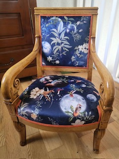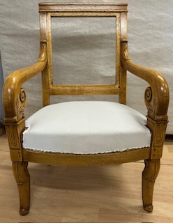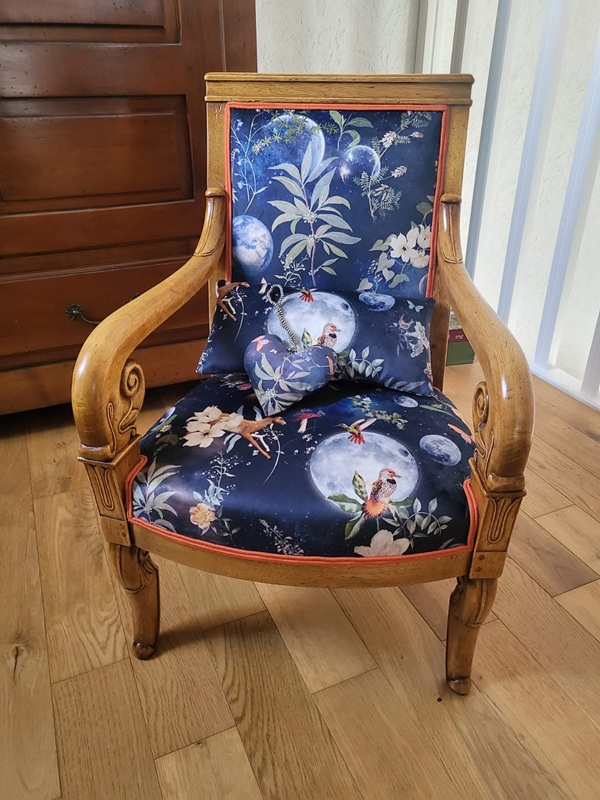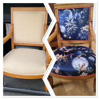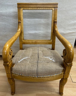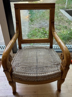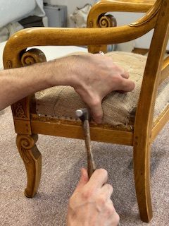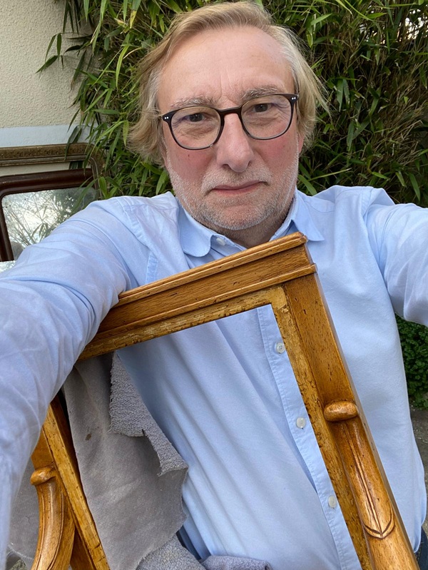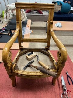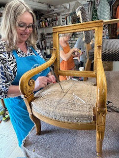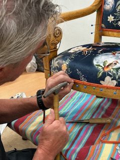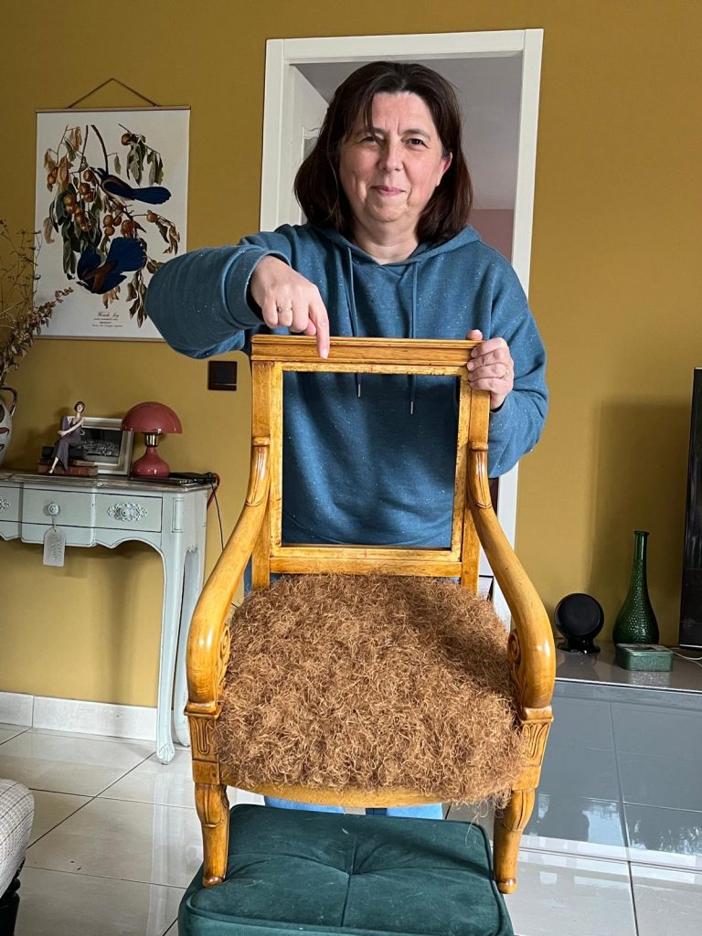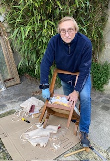 Enlèvement par Thierry du fauteuil déniché sur Le Bon Coin, dégarnissage de l’ancienne garniture contemporaine et patine à l’ancienne (Fondur et mattine gomme laque)
